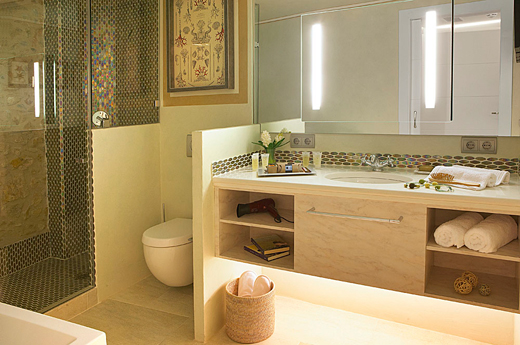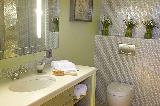 El baño de la suite, decorado con piedras cristal de murano simulan escamas marinas que otorgan un aire distinguido, acompañado de una bañera presidencial.